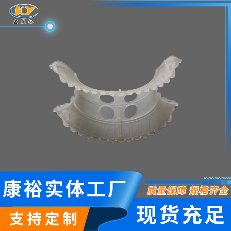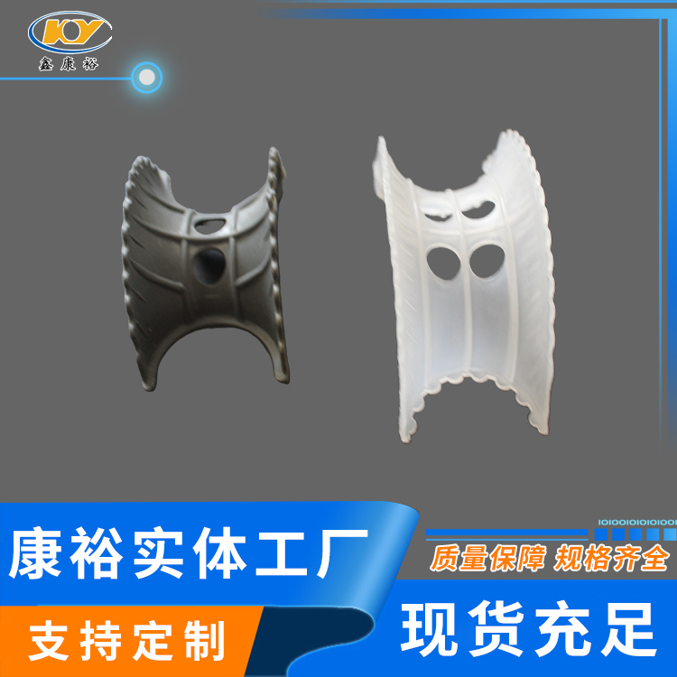 塑料異鞍環(huán)是20世紀(jì)70年代美國(guó)Noton公司對(duì)普通矩鞍環(huán)填料作出了改進(jìn),其特點(diǎn)是將扇形弧面改進(jìn)成帶鋸齒邊緣的貝殼狀弧面,并在鞍背上增加了開孔,這樣填料層內(nèi)的通道更加通暢,改善了液體分布性能,降低了氣體通過的阻力,提高了傳質(zhì)性能。塑料異鞍環(huán)鞍形填料類似于馬鞍形狀,這種填料層中主要為弧形的液體通道,填料層內(nèi)的空隙較環(huán)形填料(尤其較拉西環(huán)填料)更加連續(xù)。